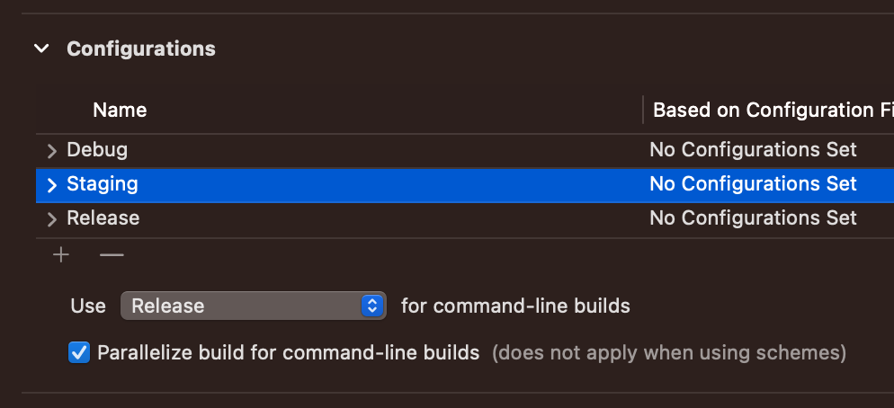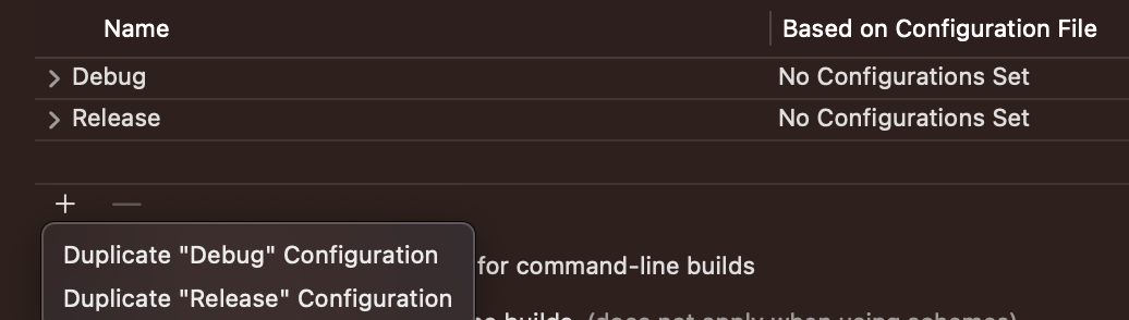 +를 누르면 어떤 설정을 복사할지 물어보는데 저는 Staging을 만들기 위해 Duplicate "Debug" Configuration 을 선택했습니다.