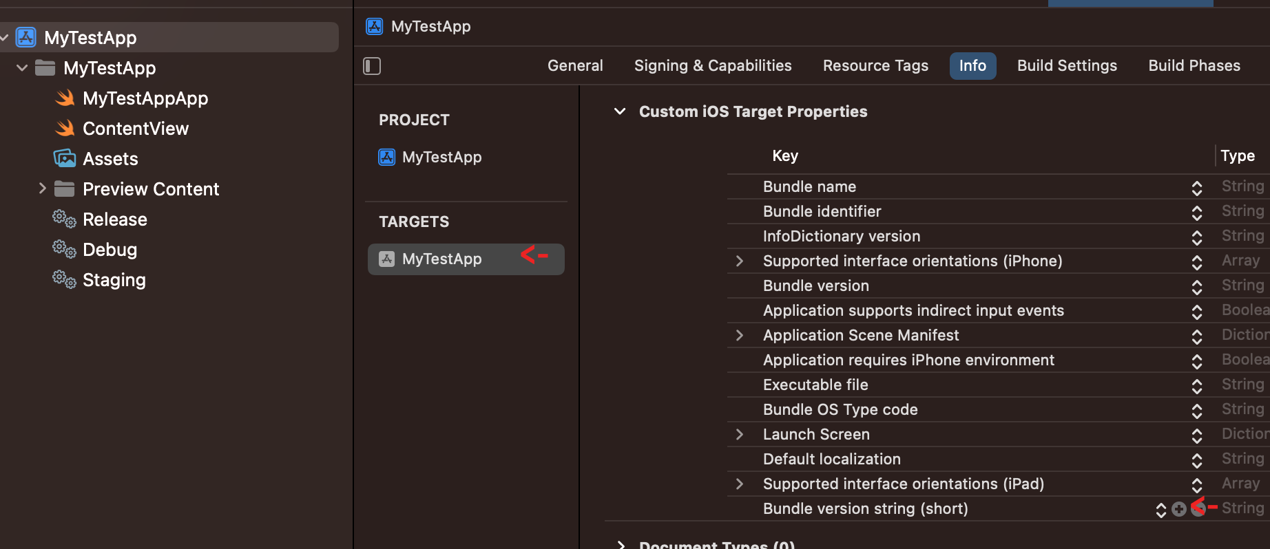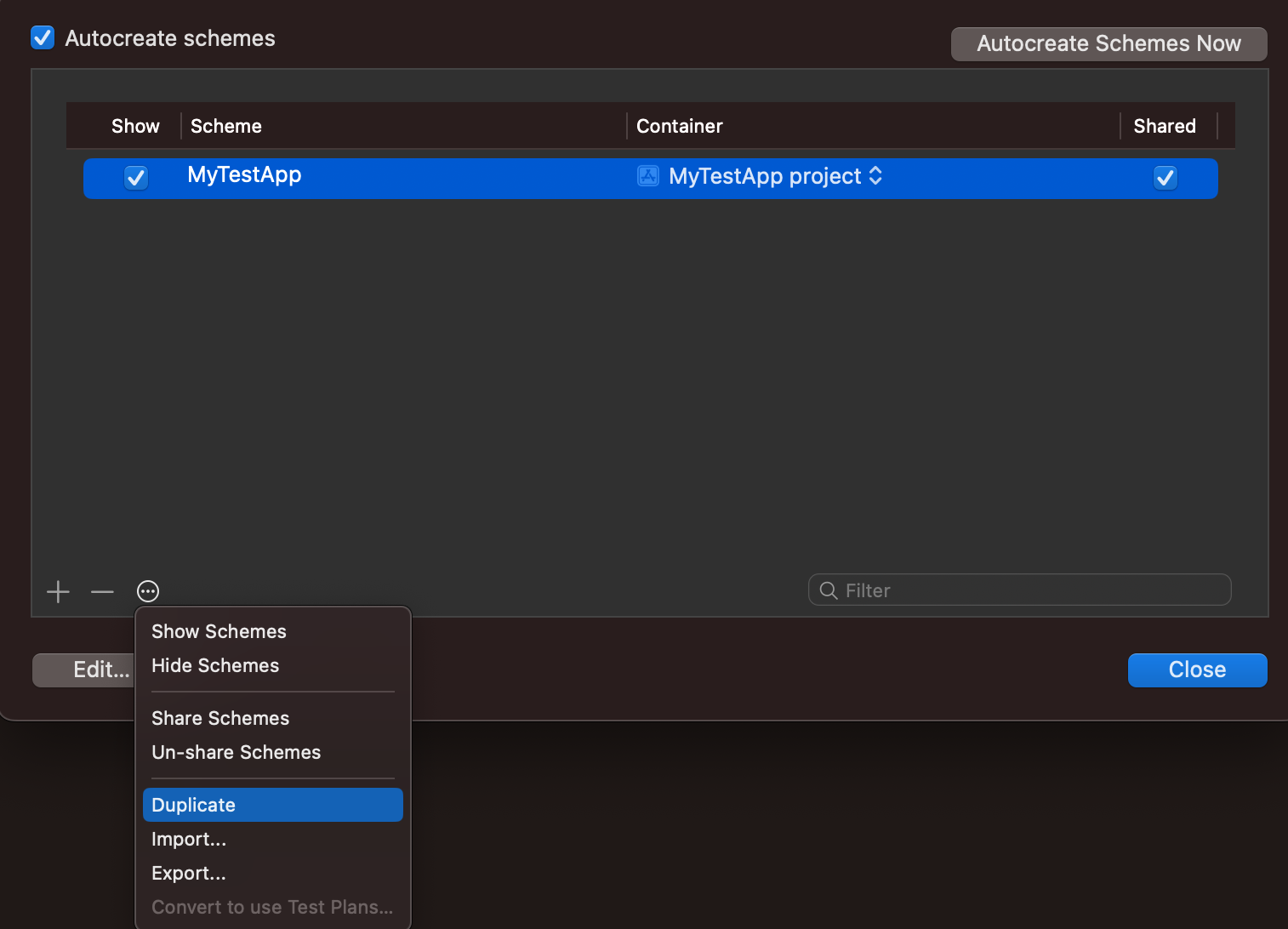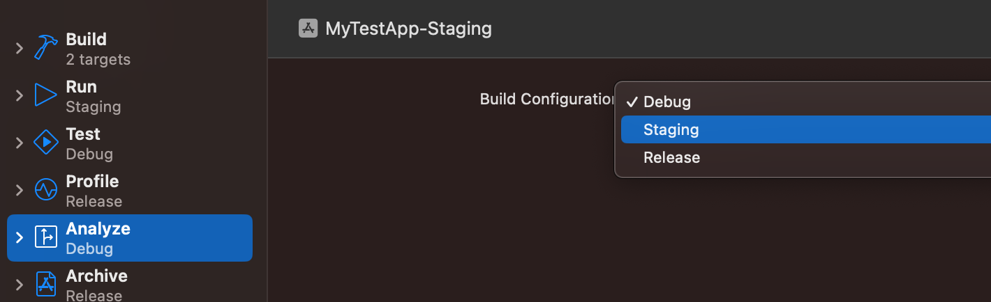 기존의 schemes 를 duplicate 해줍니다. 이름은 앱 이름이 MyTestApp 이므로 MyTestApp-Staging 으로 지었습니다.