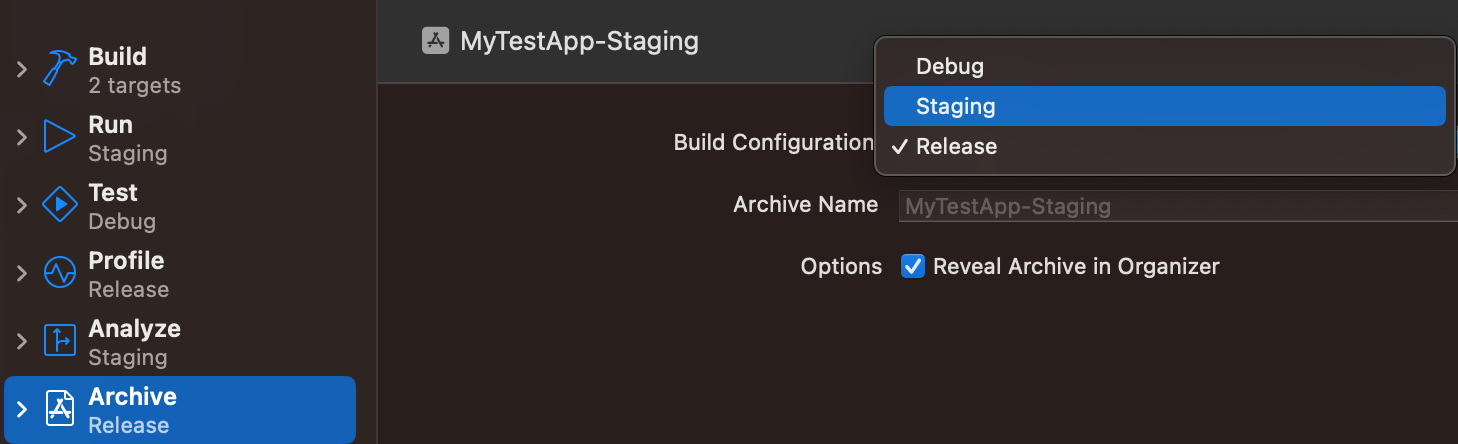 (Test나 Analyze, Archive 등 다른 옵션도 필요하다면 변경해줍니다.)