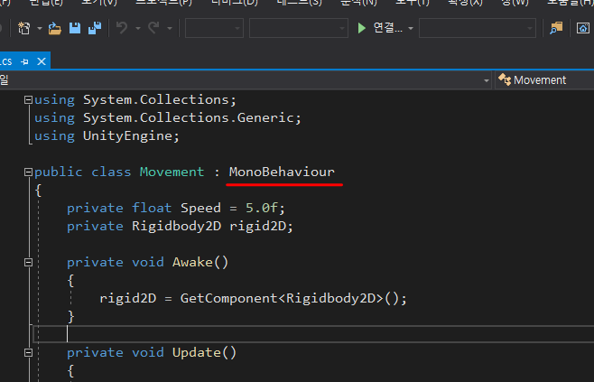 유니티에서 스크립트를 편집을 하기위해 창을 띄웠을 때 위의 그림과같이 MonoBehaviour 가 초록색으로 안나오면 연결이 안된 것입니다.