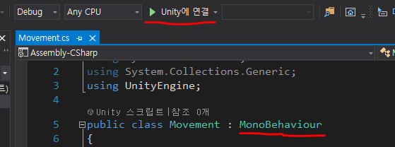 정상적으로 연결이 되있으면 위의 그림과 같이 MonoBehaviour 색깔이 초록색으로 나오고 유니티 연결 버튼이 있습니다.